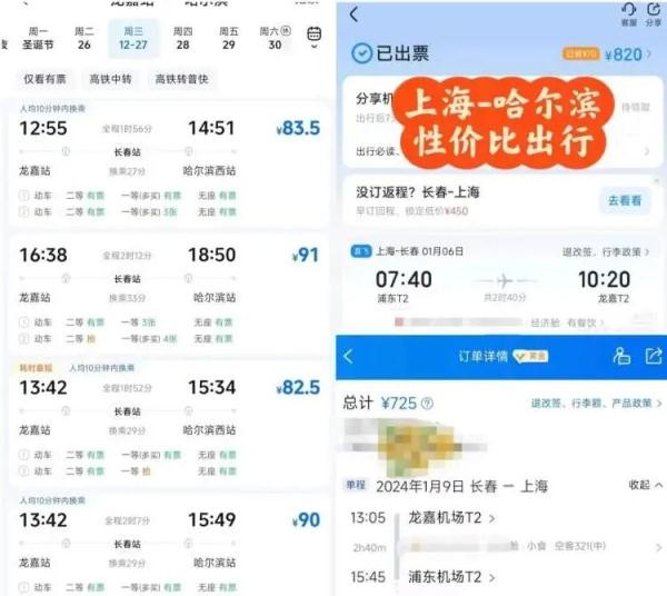 另一边,有人已经介绍了自己的曲线省钱攻略:选择坐飞机到长春、沈阳等东北城市,然后再坐火车去哈尔滨,如此“飞机+火车”的往返路线,相比直飞单程最多可省五六百,往返能省千元。