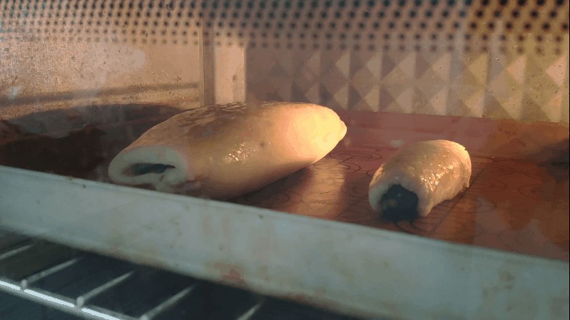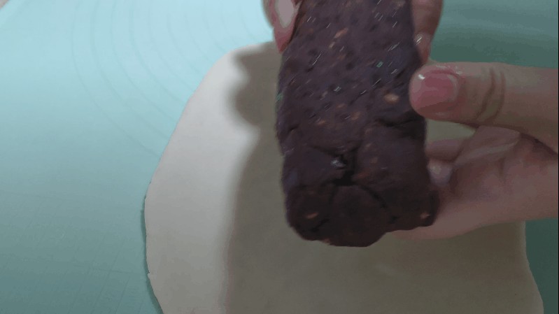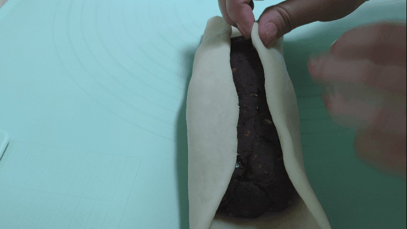 6.放入豆沙馅儿,两边包回来,收口处捏紧。