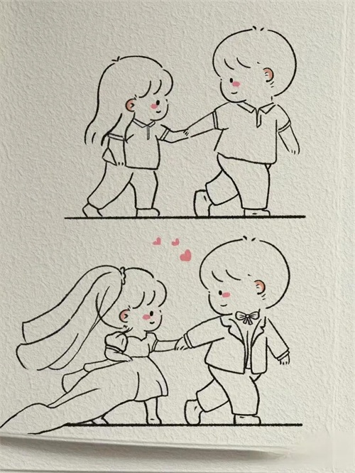 在这张简笔画中,我们看到了一对小情侣手牵手,脸上洋溢着幸福的笑容。