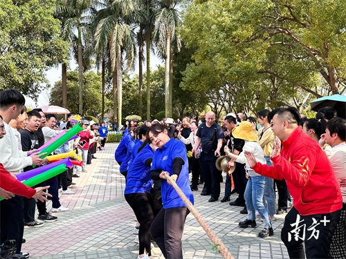 随着裁判“哔”的哨声响起,两边参赛队员脚蹬地、手抓绳,大家动作整齐划一,比赛场面气氛热烈。在旁助阵的啦啦队更是竭力大喊“加油加油”,口号声、呐喊声、欢笑声,此起彼伏。
