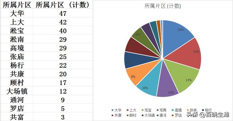 从宝山区最贵的300个小区分布来看,大华、上大、淞宝三个片区位列前三,其中大华片区占了47个小区数量第一,上大片区紧随其后42个小区上榜,排第三的淞宝片区占40个。其余片区占比情况参照下表了解。