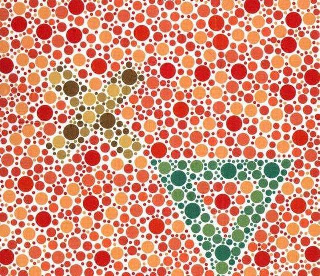 对于普通人来说,可能会一眼看出图中的图形,有绿色圆点组成的倒三角,而对于红绿色盲的人来说,不仅看不出倒三角,反而会认出褐色组成的“X”字母,极为考验学员的辨别能力!