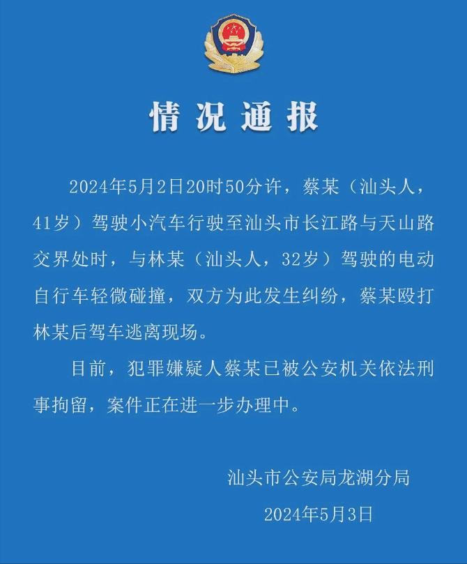 幸运的是,警方迅速介入调查。5月3日,广东汕头警方通报称,犯罪嫌疑人蔡某已被依法刑事拘留。警察的快速行动明确告诉大家:不管你是什么身份,打人这种暴力行为都是不对的,我们绝对不会放过!