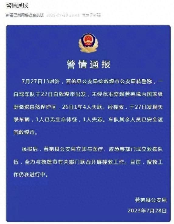 2023年7月28日,新疆巴州若羌县警方通报一车队未经审批穿越罗布泊致3死1的失联事故。据悉,22日一自驾车队自敦煌市出发,未经批准穿越若羌境内保护区。26日,1车4人失联,27日发现失联车辆,3人无生命体征,1人失踪。