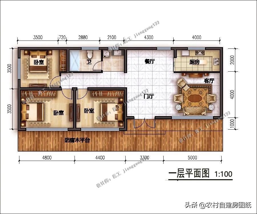 这款一层平房外观朴实大方,建筑成本低,大面积的平屋顶极大地增加了平房的利用空间,在农村晾晒谷物非常方便。经门廊入户既是一个开阔的大客厅,客厅与餐厅互借空间,南北通透,非常的敞亮。厨房紧邻餐厅,取餐用餐都极为方便。建筑的东侧有一间主卧,紧邻卫生间,南向采光,非常舒适。西侧有两间次卧,南向次卧空间也很宽敞。三室二厅一卫,经济实用,适合农村养老居住。