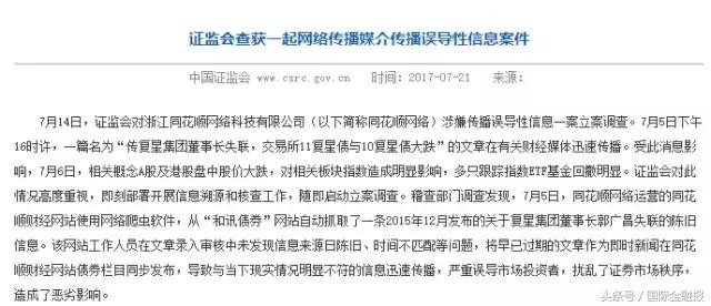 而7月22日,郭广昌以一篇“谣言止于智者”亲自辟谣。随后,证监会迅速排查,证实该消息子虚乌有,于是责令消息源头改正违法行为,且开出罚单。