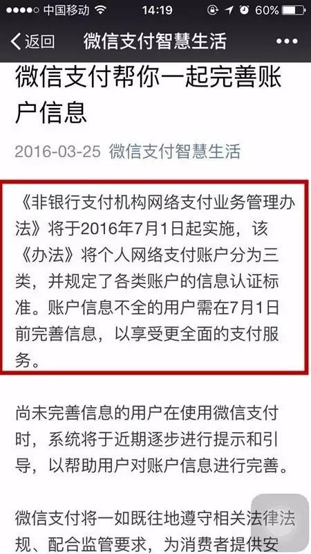 3月25日,微信支付在其官方账号“微信支付智慧生活”发布文章,提示“账户信息不全的用户需在7月1日前完善信息,以享受更全面的支付服务。”