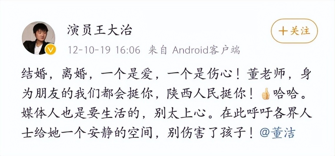 2012年10月20日董洁单方面公布离婚声明,王大治于当年10月19日在社交平台力挺董洁:董老师,身为朋友的我们都会挺你……紧接着董洁工作室也发文:身为男人,你怎么就不能勇敢的告诉大家,你们分开的原因是因为你嗜赌成性,粗暴无礼……