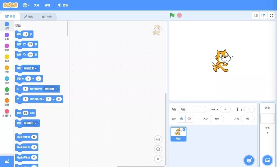 左边就是预设的编程积木块,看上去就像拼图的分片一样中间空白区域是编程区域,就是把积木块拖拽到这个区域,进行组合编程右边区域分两部分,上面是舞台区域,说白了就是预览区域,用于看程序运行效果的,下面则是角色资源信息列表和舞台信息列表,就是程序里涉及的所有可以看见的内容的资源管理列表