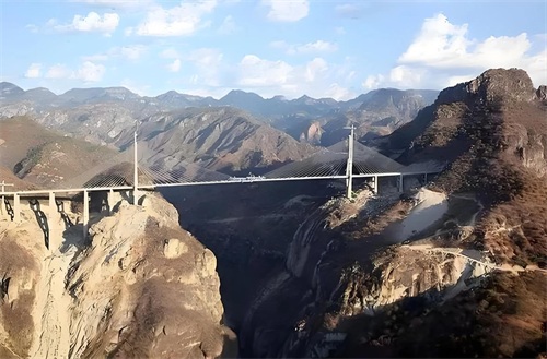 墨西哥巴特阿鲁大桥,位于墨西哥,2008年开始修建,于2012年竣工,耗资1.59亿美元。桥梁全长1124米,主跨520米,桥面距谷底高度为390米。