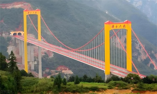 四渡河大桥,位于湖北省恩施土家族苗族自治州境内连接宜昌市与恩施市的高速通道,也是中国国内首座山区特大悬索桥,2004年动工,2009年通车,总投资6.18亿元人民币。桥面行车道与峡谷谷底高差达496m,曾被誉为世界第一高悬索桥。