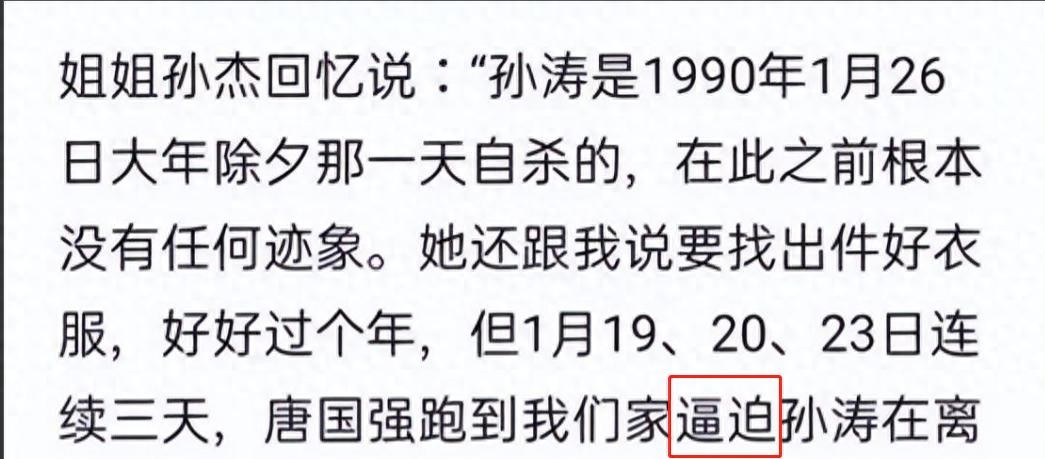 据孙涛的姐姐回忆,唐国强一直在逼迫孙涛离婚,1990年过年之前的那几天,唐国强还在不断提起这个话题。
