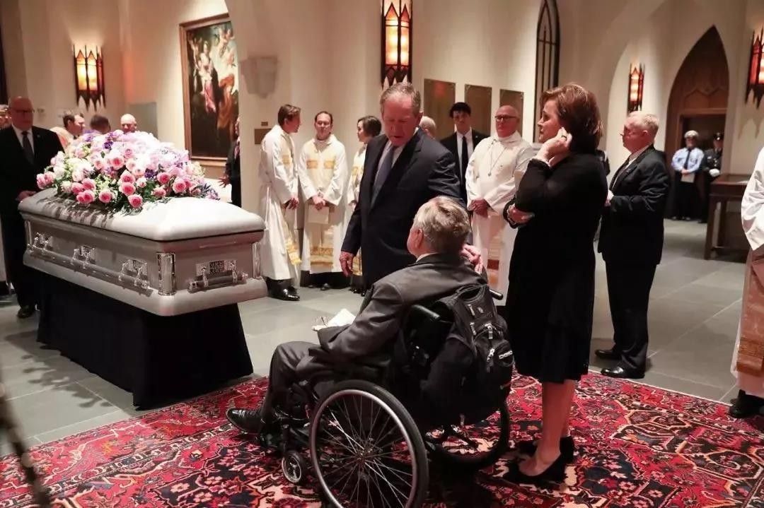 这场葬礼上,老布什穿着一身灰色西装,搭配着深蓝色领带,坐在轮椅上,由儿子小布什推到了芭芭拉的棺木前。