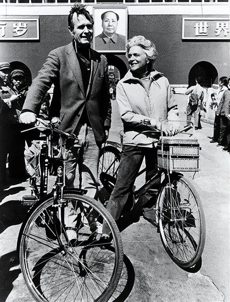 两年后,老布什来到中国负责联络工作,他把爱人芭芭拉也一同接到了中国,他们一同骑着自行车,在北京天安门前快乐地游逛,依然像是一对亲密无间的夫妇。