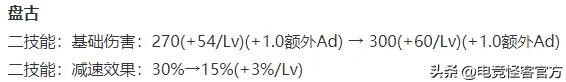 一技能伤害数值有明显增加,但AD加成改为了额外AD加成,一技能CD从固定9秒改为9~8秒。二技能的减速效果前期对半砍,后期不变。