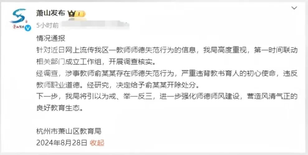 当地教育部门在8月28日就此事件对外发布了情况通报,决定对涉事体育男老师俞某某给予开除处分。