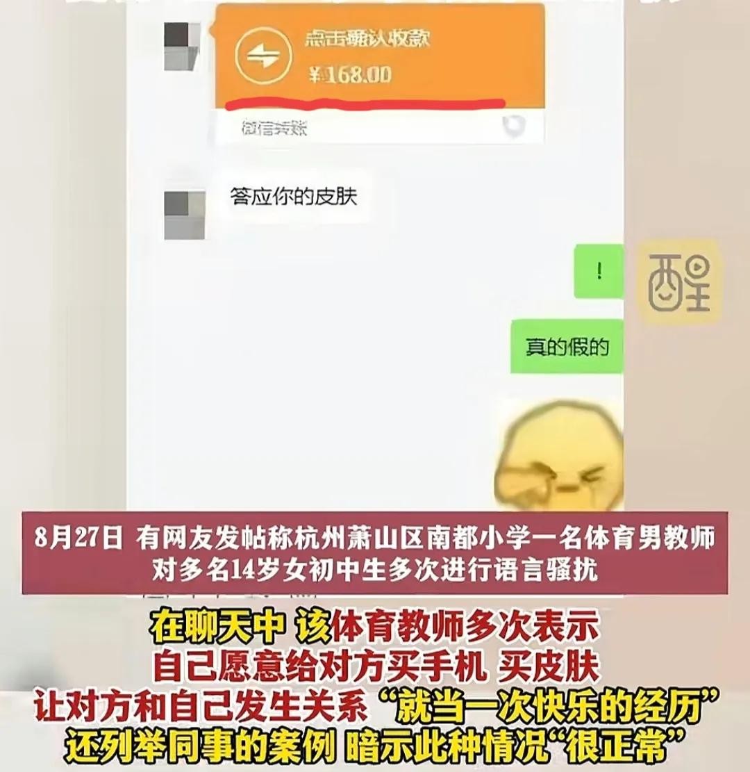 8月27日,一名网友在网上发帖称杭州萧山区南都小学一名体育男老师对多名14岁初中女生多次进行语言骚扰。