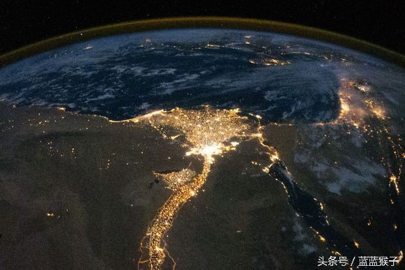 埃及尼罗河三角洲夜景,人们都聚居在尼罗河两岸,很好的诠释了大河文明的形成。