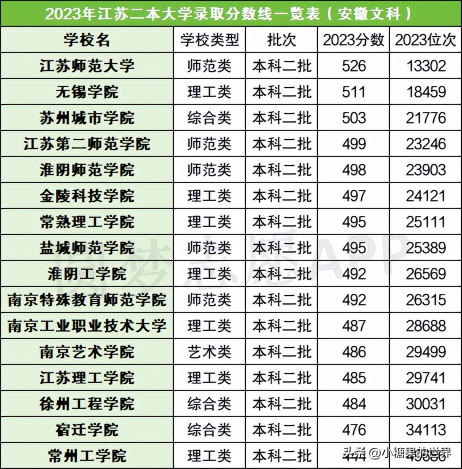 以安徽2023年的招生数据为例,在理科方面,江苏二本院校的录取线在455-505分之间,位次在78185-132453之间;在文科方面,江苏二本院校的录取线在444-526分之间,位次在13302-49686之间。