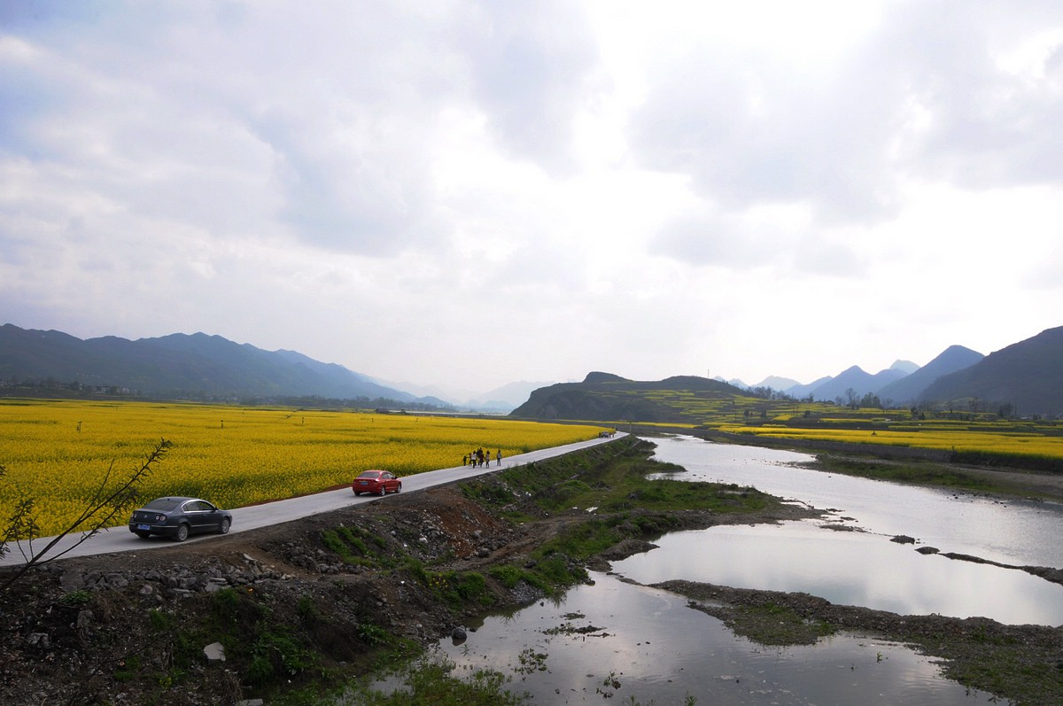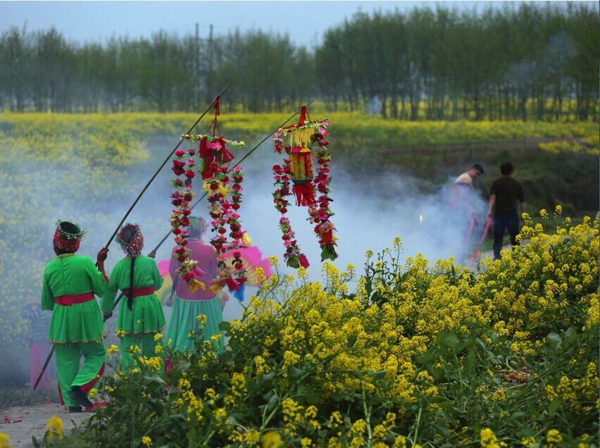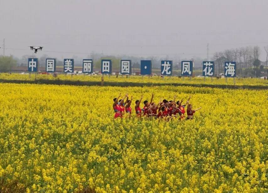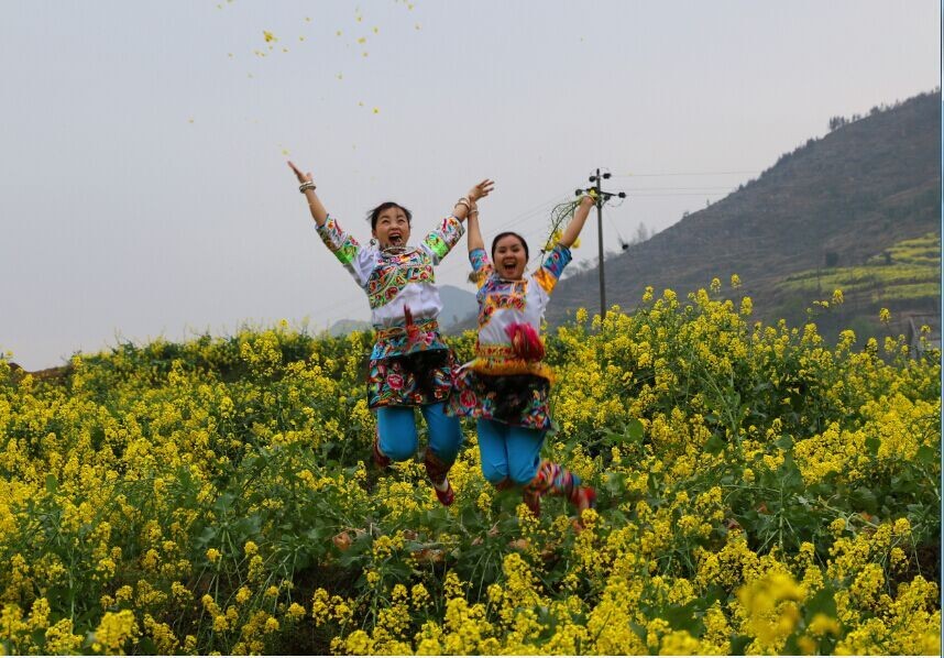 美丽的姑娘们趁着空闲时间与大片的油菜花“嬉戏”在一起。