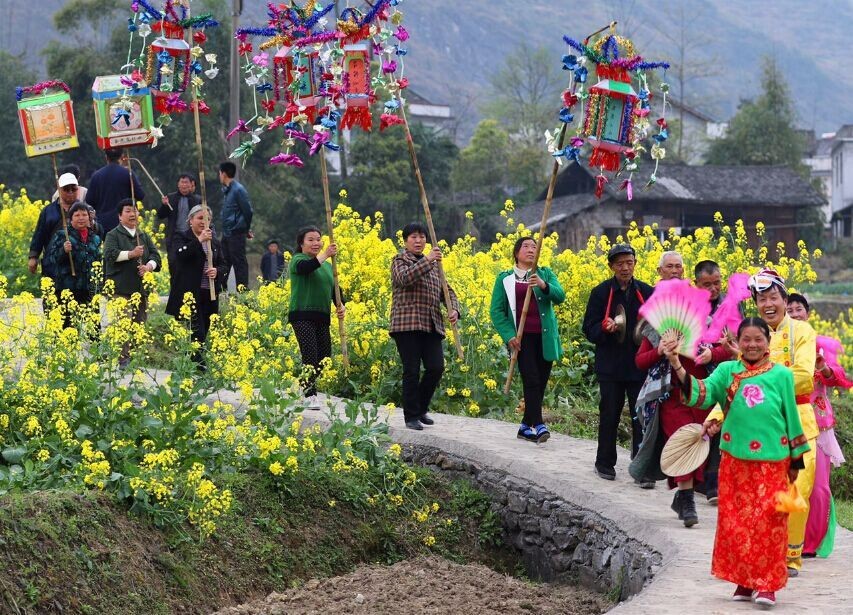 今天是花灯表演的日子,表演者们都换上了喜庆的服装有的拿扇子,有的举花灯,不分老少,满脸欢喜的行走在路上。