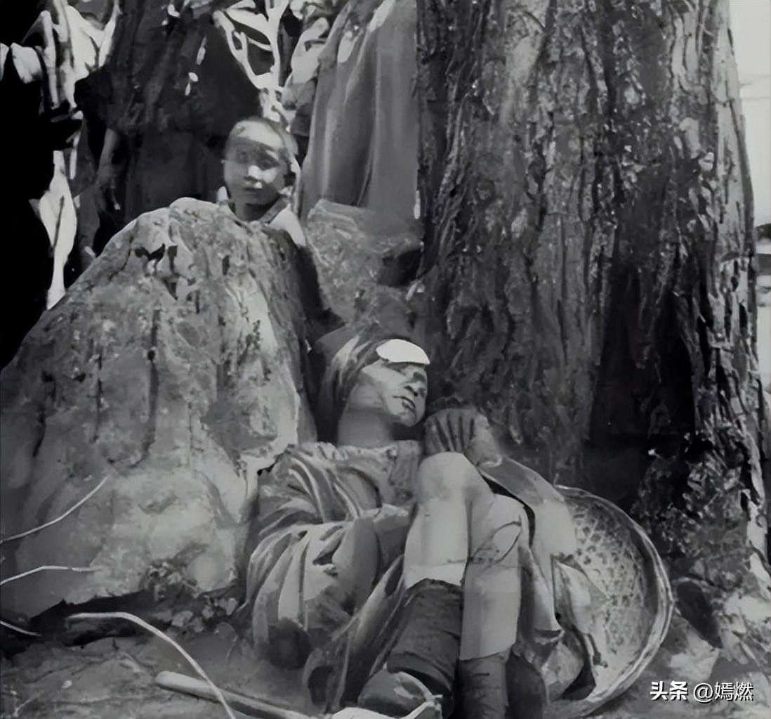 25 衣不蔽体,在大树下乘凉的老妇人,后面还有孩童偷窥