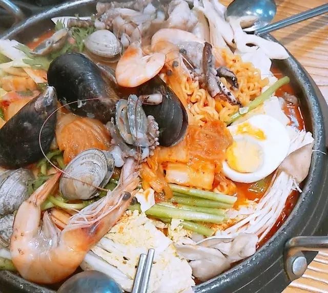 他家的石锅拌饭无功无过吧,食材蛮多味道还是可以的,毕竟韩餐的味道大都是韩式辣酱一种味道。至于部队火锅小编强烈推荐海鲜部队火锅,料很足,虾、鱿鱼、贝壳类、鱼饼啥的都有,满满一大锅,两个女生的话足够。