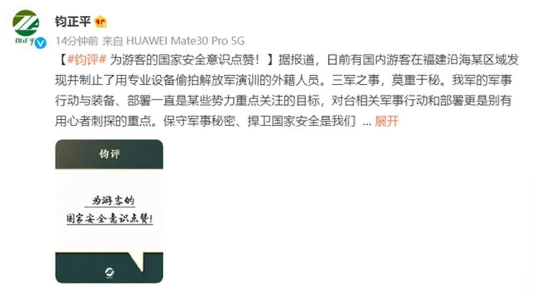 或许有人会觉得纳闷,解放军演训不是公开的吗?社交网络上不是也有很多沿海居民拍摄的图片视频吗?为什么外籍人员拍就是偷拍,就需要提高警惕?这还是跟拍摄的精度和目的有关。不少普通民众拍摄的军演,图像都比较模糊,或者只有声音,只看得出军演的氛围感。
