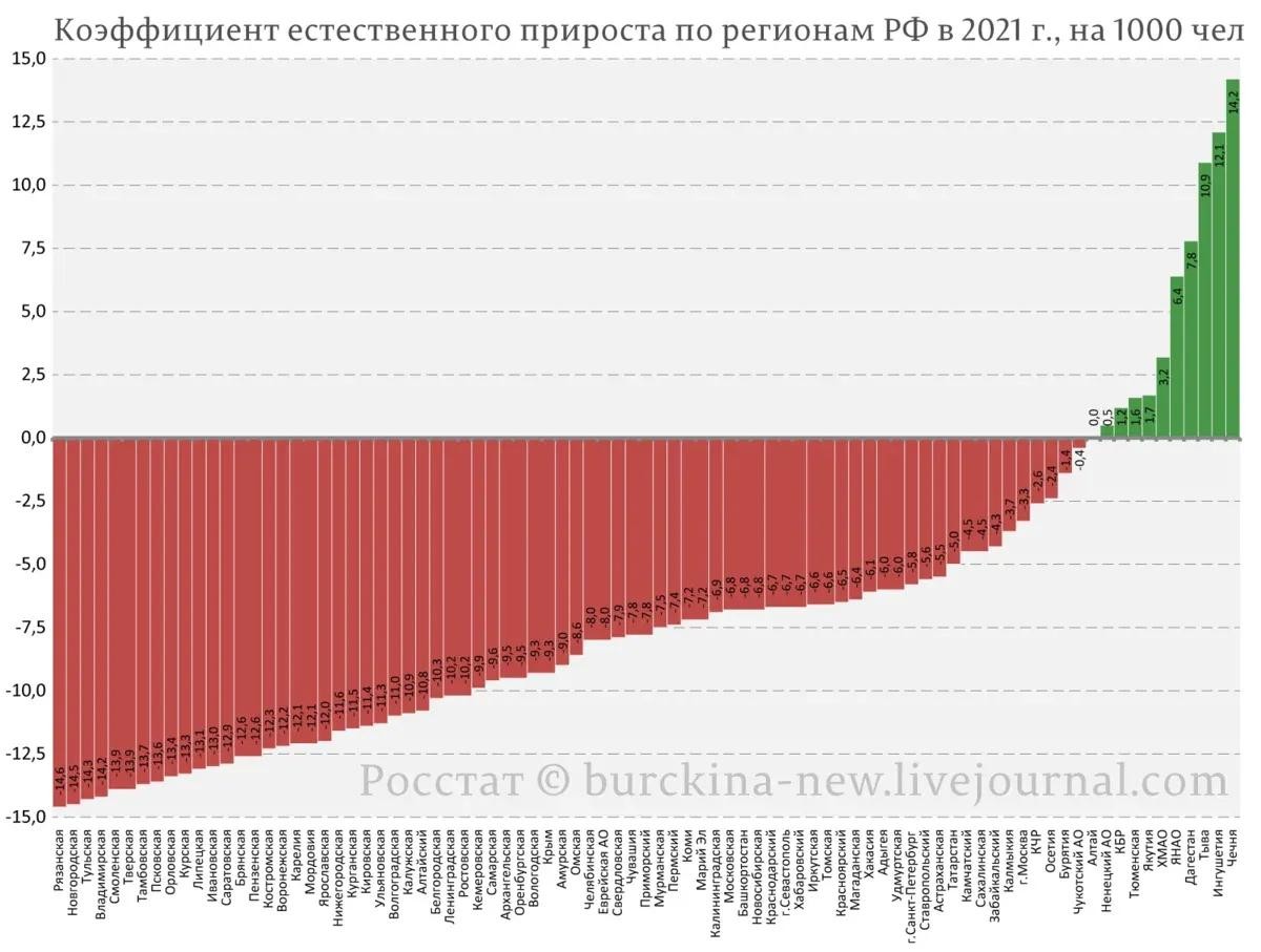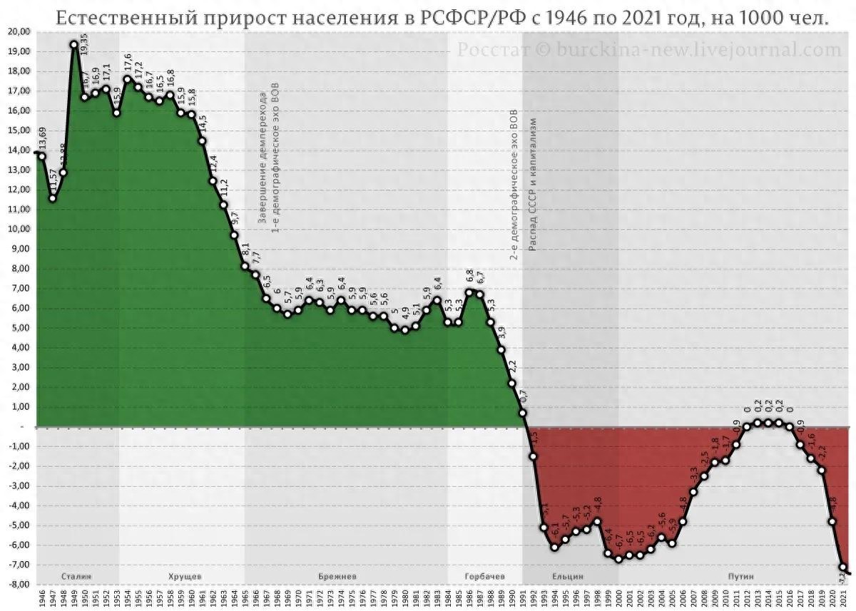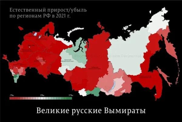 自1945年以来,俄罗斯从未出现过如此巨大的人口流失,而且在没有任何大规模战争或饥荒的背景下。例如,在1947年发生大饥荒期间,俄罗斯仍然保持了千分之11.6的人口增长,而在2021年,人口却减少了7.2‰。