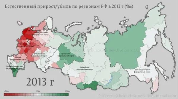 从地图上可以看出,历史上俄罗斯人口密集地区人口正在迅速减少。人口增长的地区主要是广袤的人口稀少地区,还有盛产石油天然气的地区,还有告别战乱的车臣、达吉斯坦或图瓦等一些民族自治地区。