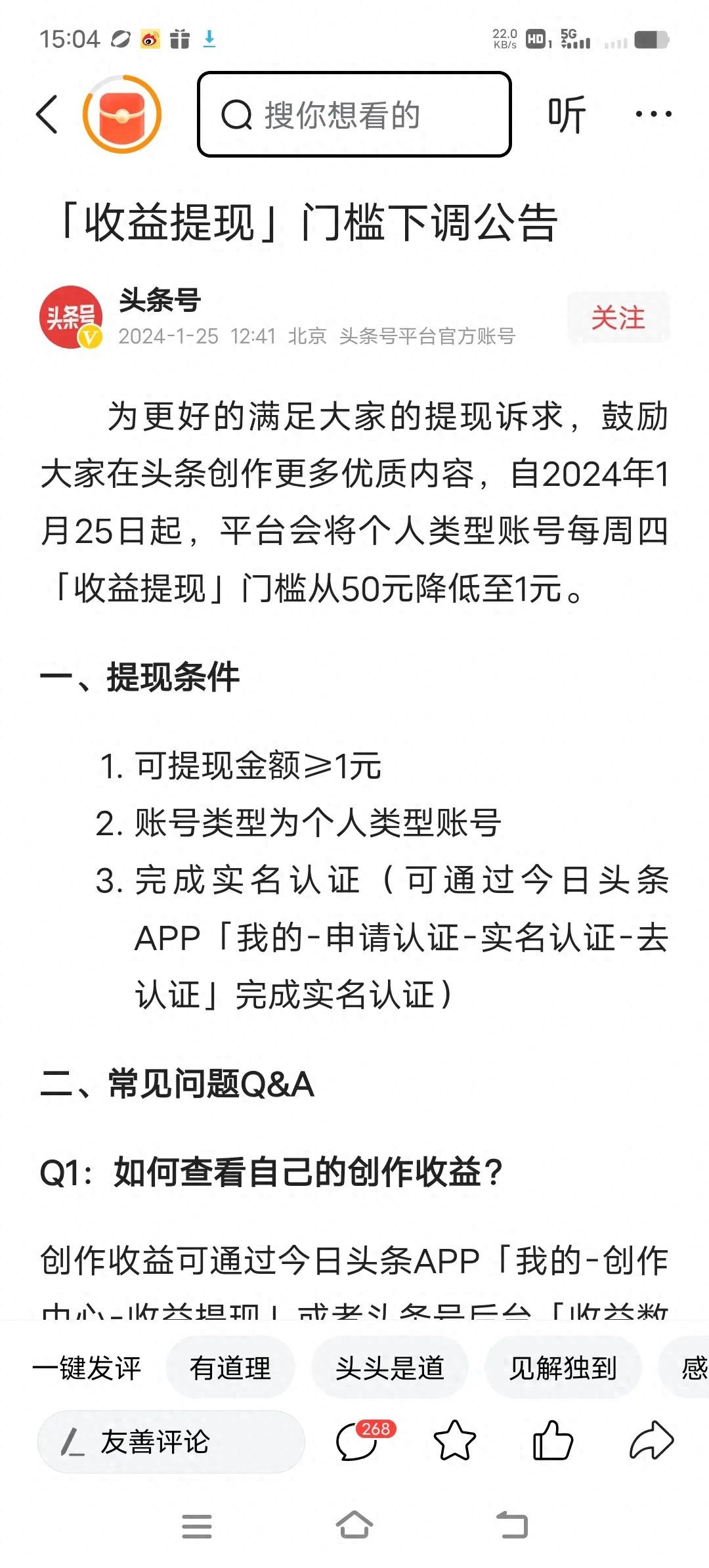 之前,我们在今日头条写文章的收益超过50元才可以提现。从1月25日起,头条对提现门槛降低了,1元就可以提现了。