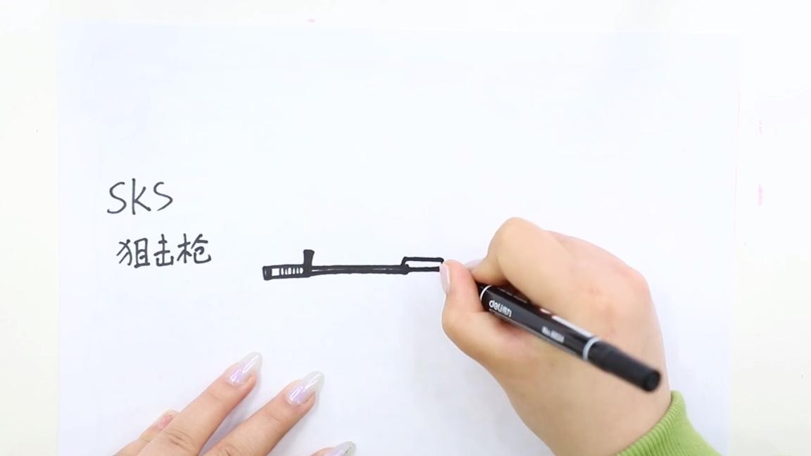 SKS狙击枪:步骤①用线条画出它的枪头,接着给它画上细长的枪管;