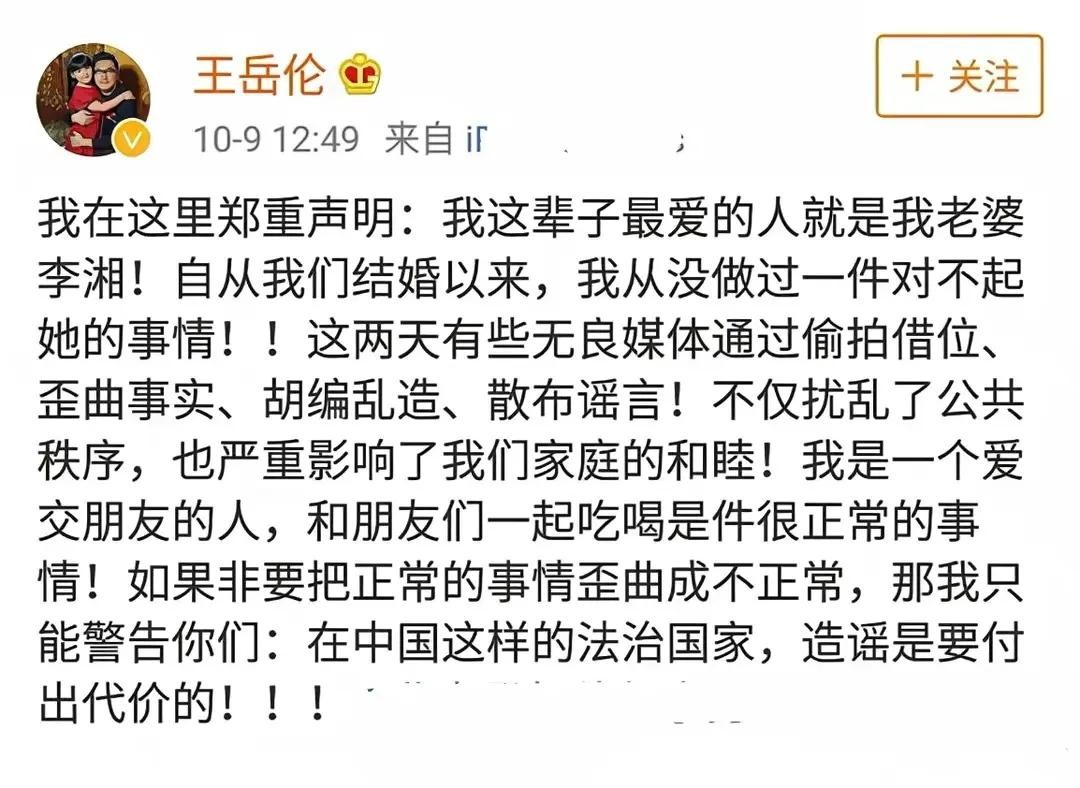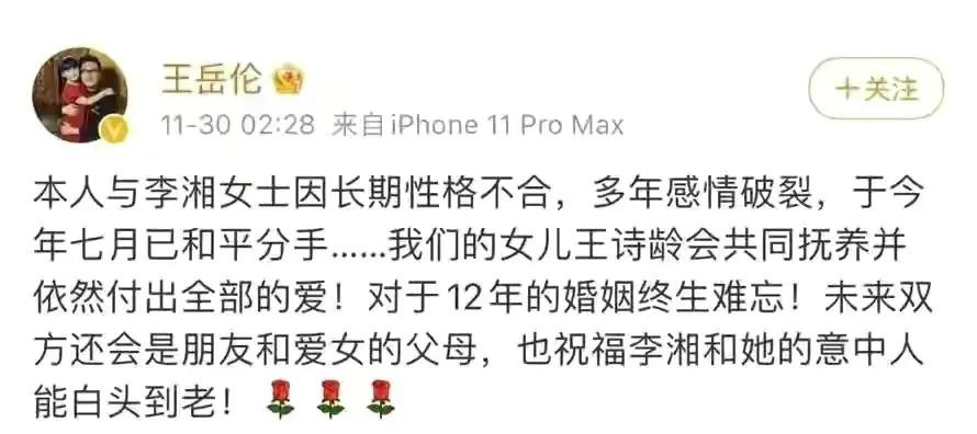 网友都在等着看李湘怎样收拾残局时,王岳伦突然发文:“本人与李湘女士因长期性格不合,多年感情破裂,于今年七月和平分手,祝福李湘和她的意中人白头到老”。