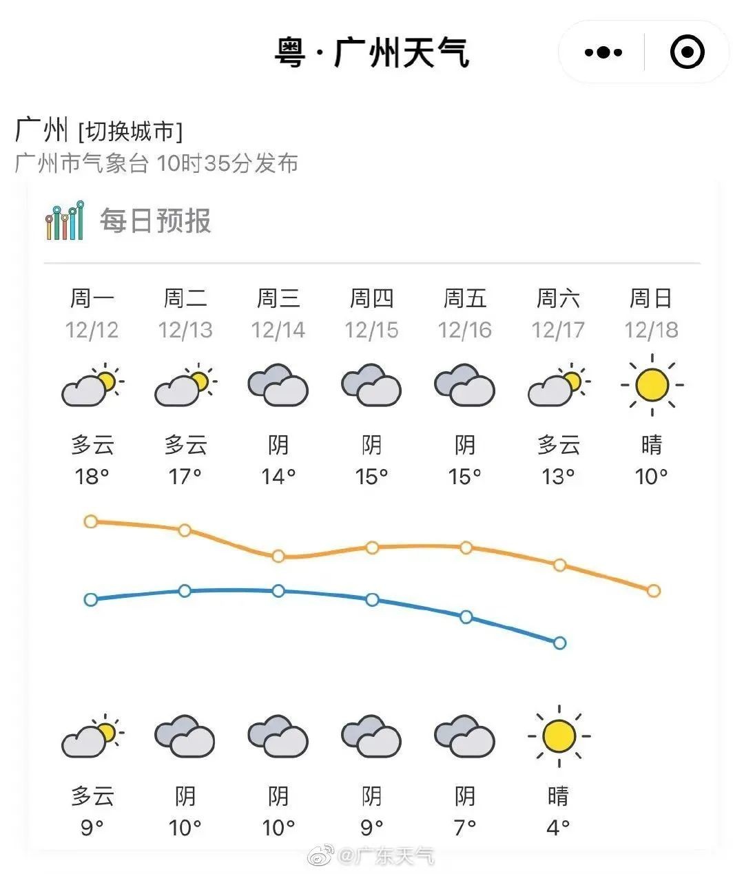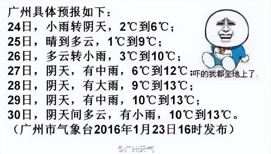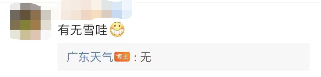 就在大家半信半疑之际,@广东天气 出来回应:根据最新预测,本周日(18日)天气晴朗,气温最低4℃,最高还有10℃左右。翻译过来,就是今年广州落雪可能“得个吉”。