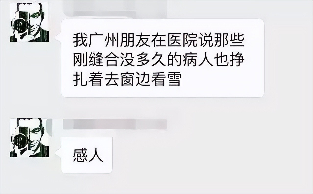 很多朋友涌上白云山赏雪,造成交通瘫痪,甚至连在医院里治疗的病人都挣扎起来看雪。