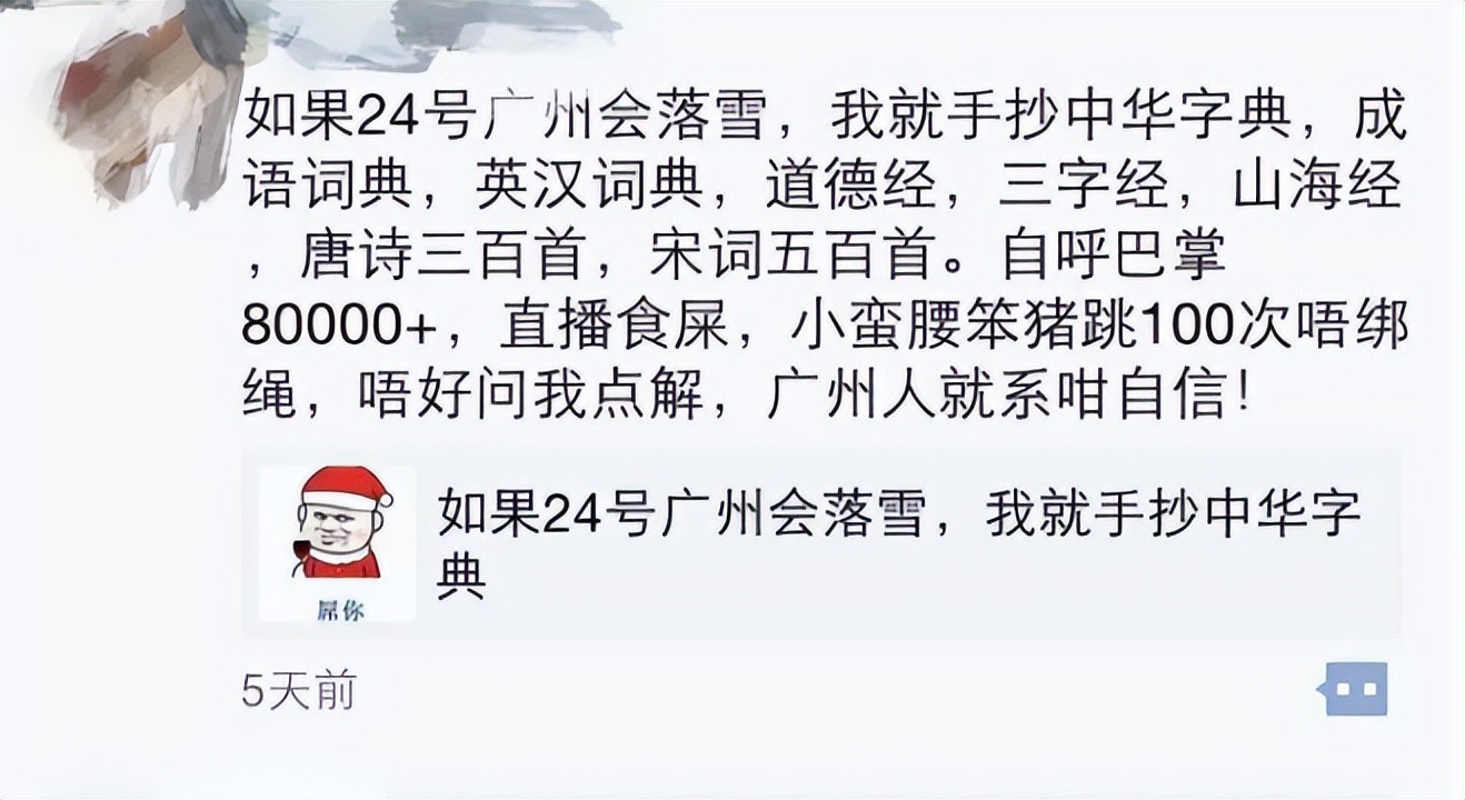当时,“X城网”某小编在24日前曾经口出狂言,“如果广州24号喺落雪,就生吞新华字典,裸奔,直播吃s…”,引起大批网民的围观。互联网是有记忆的,不知道事情的后续如何呢?