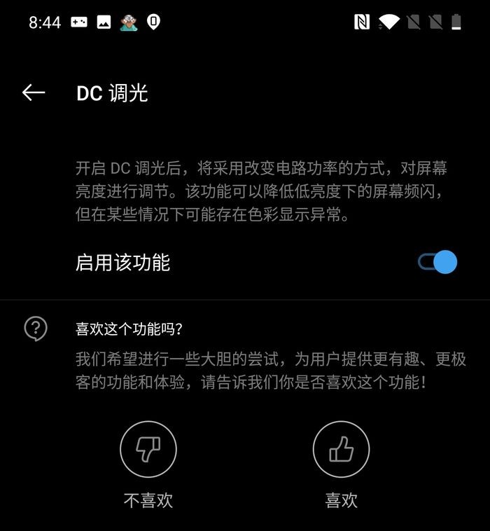 众所周知,由于采用了PWM调光,屏闪问题导致的伤眼对于OLED屏幕用户来讲一直是非常难过的。幸运的是,除了高分辨率、高刷新率以及出色的屏幕素质外,一加7 Pro的屏幕作为一块OLED屏幕,居然支持手动切换DC调光。在“设置-工具箱-一加实验室”即可切换。