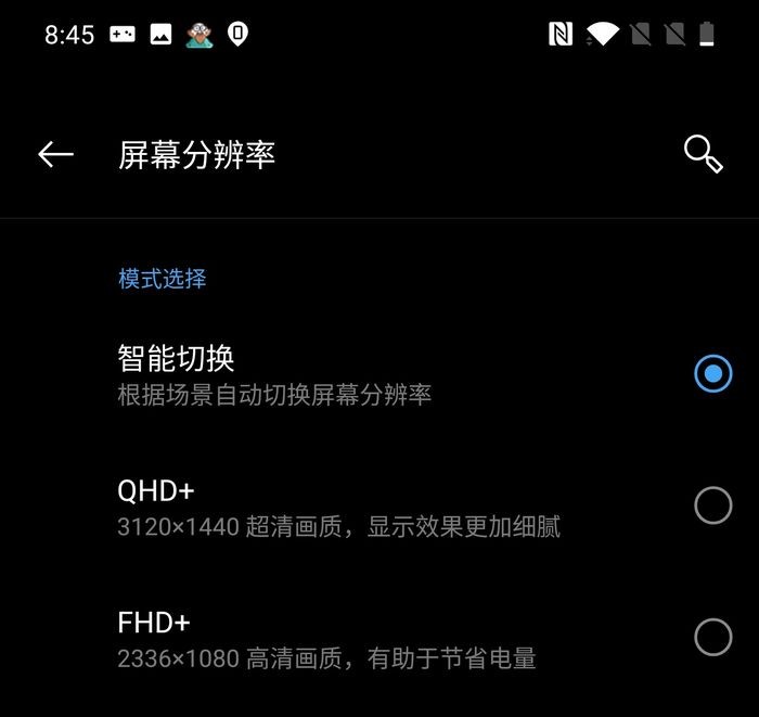 可以说“分辨率比一加7 Pro高的手机,刷新率没有一加7 Pro高;刷新率和一加7 Pro一样或者更高的,屏幕分辨率不如一加7 Pro。”自然更高的屏幕分辨率意味着耗电量的增加,因此在设置中一加对屏幕分辨率提供了三种选项,除了QHD+和FHD+之外能够智能切换,根据场景自动切换屏幕分辨率。