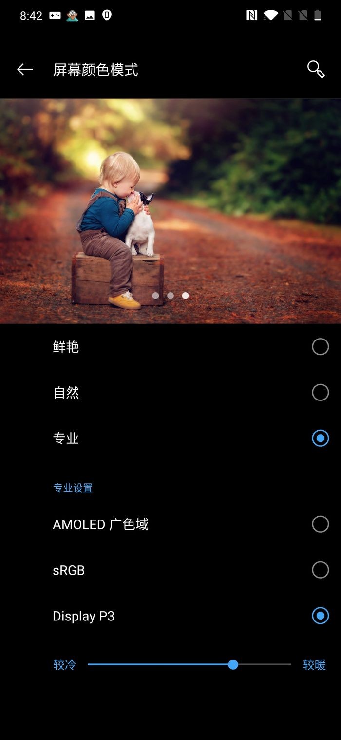 一加手机7 Pro在显示设置上提供率比较丰富的选项,除了常规的鲜艳、自然选项之外,在专业模式中可以设置AMOLED广色域、sRGB和Display P3三种选项,并且可以根据自己的偏好来设置偏冷或者偏暖。