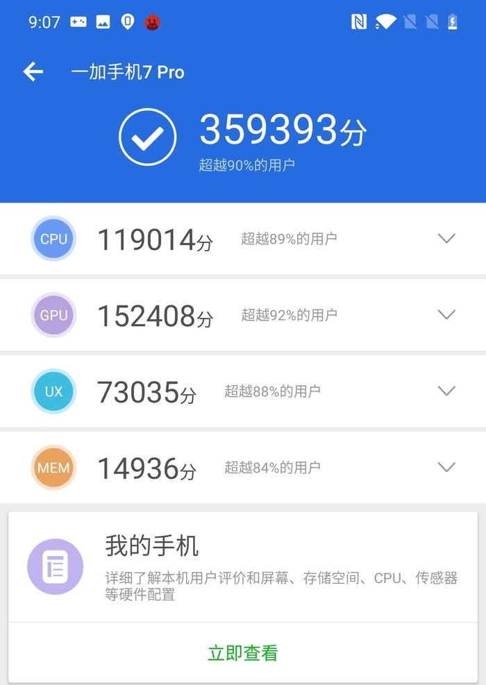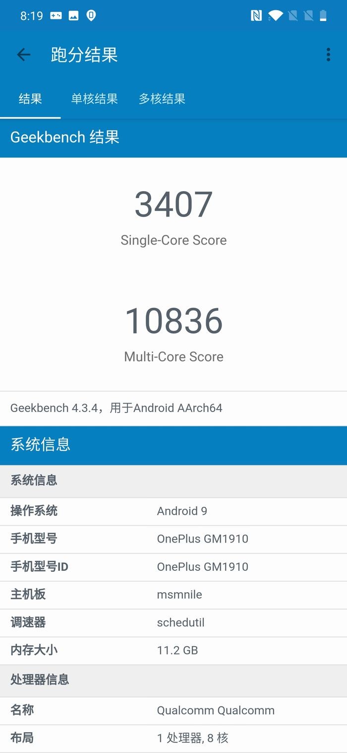 一加7 Pro在性能输出上的表现毋庸置疑,安兔兔跑分成绩为总分359393分,GeekBench 4单核3407分,多核10836分。