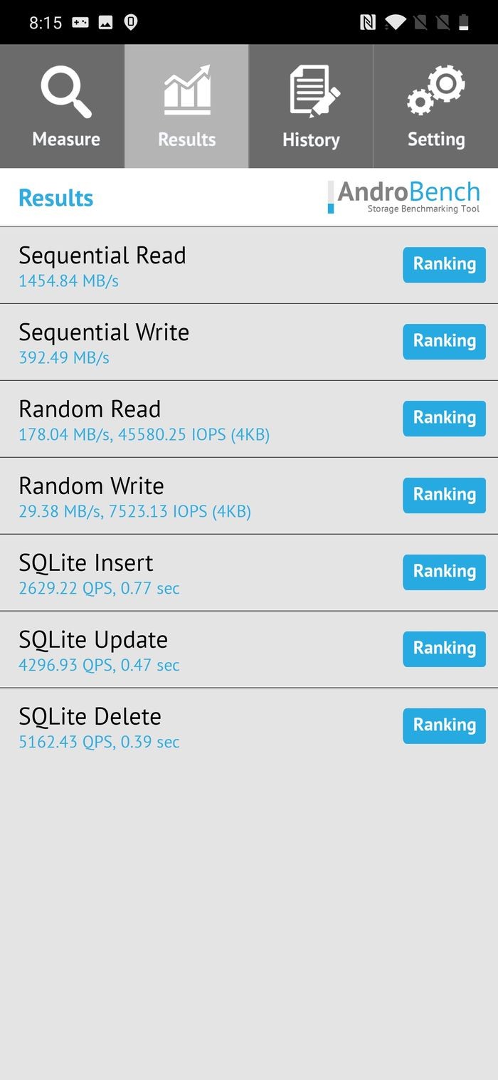 一加7 Pro还全系标配了UFS 3.0闪存,意味着读写速度会更快,游戏以及应用的启动速度也更迅速。本次收到的评测机器是12GB内存+256GB存储版本,我们使用AndroBench进行了跑分测试,其连续读写速度分别为1444.81MB/s和389.66MB/s,相比UFS 2.1提升巨大,配合原本就很流畅的氢OS和90Hz刷新率,日常使用速度起飞。