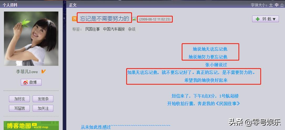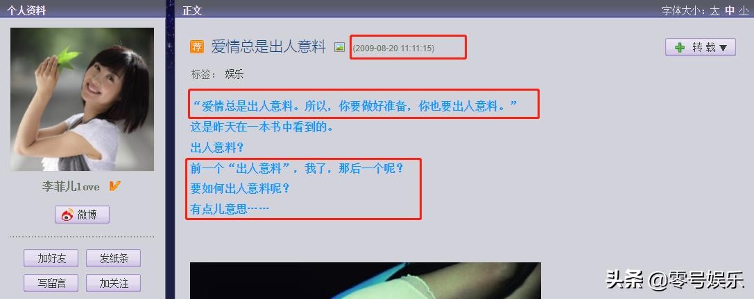 2009年,8月12日和20日,李菲儿发布两篇博客:《忘记是不需要努力的》、《爱情总是出人意料》,疑似感情出现问题!
