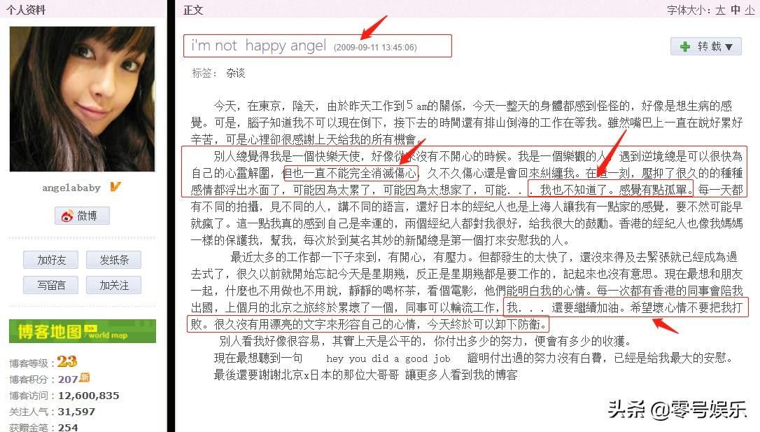 2009年9月11日,Angelababy发布题为《i'm not happy angel》的博客,表达了自己的压抑和孤独: