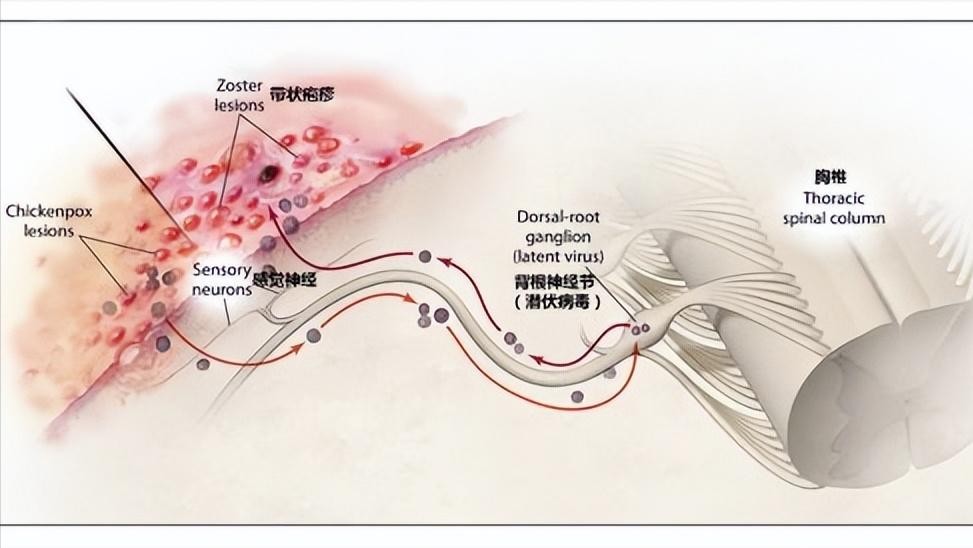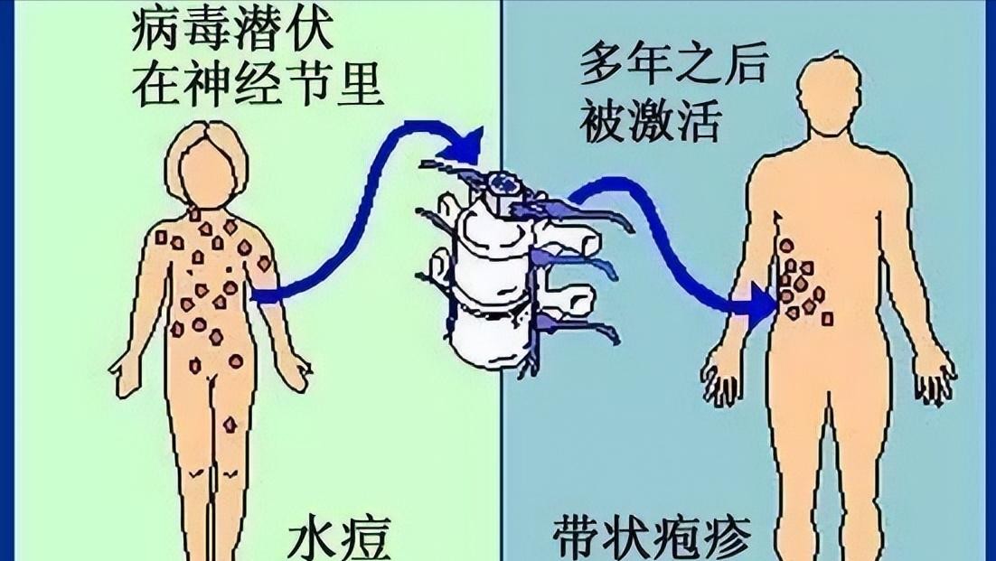 这种病毒初次感染,症状表现为水痘。如果不及时根除,大概率会长期潜伏在神经节里。随着免疫功能的减弱,这种病毒会再一次活动,并在潜伏神经所支配的区域大量复制,损伤神经,从而形成疱疹。