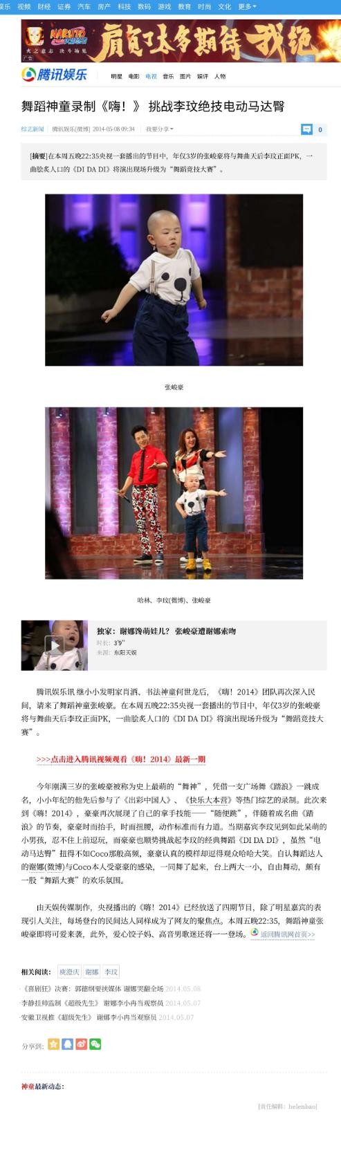 舞蹈神童录制《嗨!》挑战李玫绝技电动马达臀 绿艺新闻讯乐2014-05-0809:34