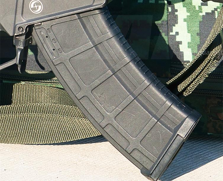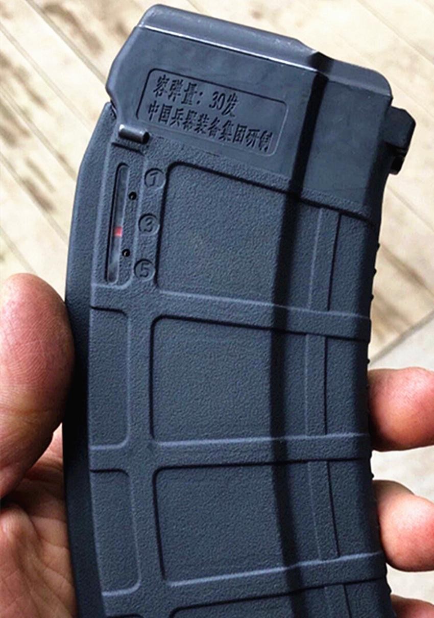 新型步枪所配用的弹匣为塑料制,与之前95式枪族的塑料弹匣有所区别,比如余弹观察口,从其中1、3、5的数字标记和靠近握把一侧的开槽来看,并不是通过直接看到子弹的尾部来观察,而应该是在弹匣内托弹板上,有红色或其他鲜明色彩的标记,通过观察孔看托弹板位置,来判断剩余弹药量。这样一来,首先不必使用性能上比较挑剔的透明/半透明材料来制造弹匣,保证了弹匣的坚固可靠;而战士只要将武器微微偏转看一眼,即可了解自己是否需要马上换弹匣。
