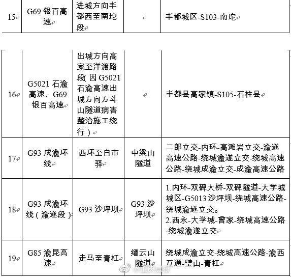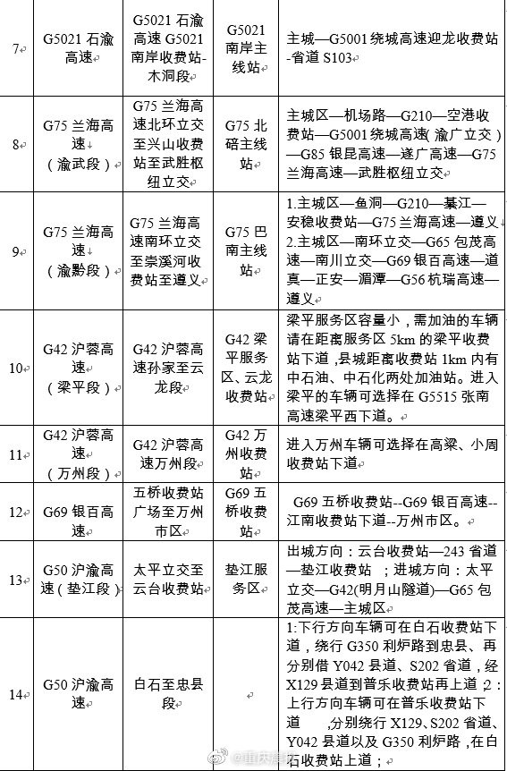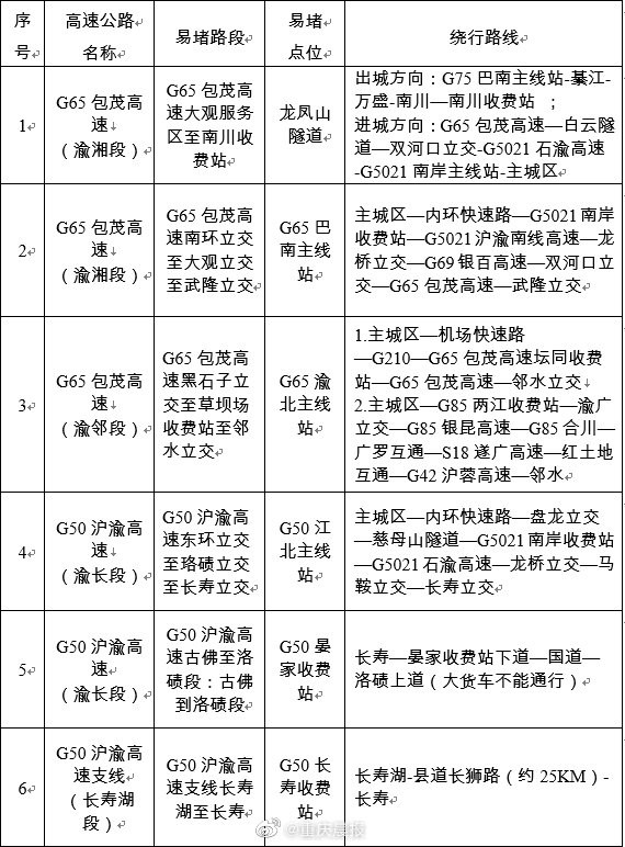 重庆新闻【“五一”假期高速全免费!避堵方案看过来】今年“五一”假期从5月1日起至5月5日止,高速公路实行免费通行。据预测,今年“五一”假期高速公路车流量可能达690万辆车次,日均车流量约138万辆次。5月1日8:00—12:00将为出城车流高峰时段;5月5日15:00—21:00将为返城车流高峰时段。针对“五一”节高速公路易堵路段,重庆市交通运输综合行政执法总队向市民提供绕行线路或推荐线路。无论您是回乡探亲还是短途旅游,请收好这份出行指南。