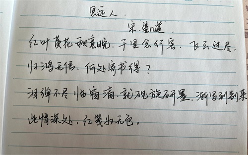 林叶转红,贺豹开遍,又是晚秋时节,我不禁想念起干里之外的游子来了。天边的云彩不断向远处飘去,归来的大雁也没有指来他的消息,不知道游子的去处,能往何处寄书呢?我越失望越思念,伤心得临的择泪,泪流不止,滴到观台上,就用它研爱号信吧。点点淌滴,一直号到商别后,情到深处,泪水更是一发不可收,滴到信笔上,竟然把红笺的颜色给染褪了。