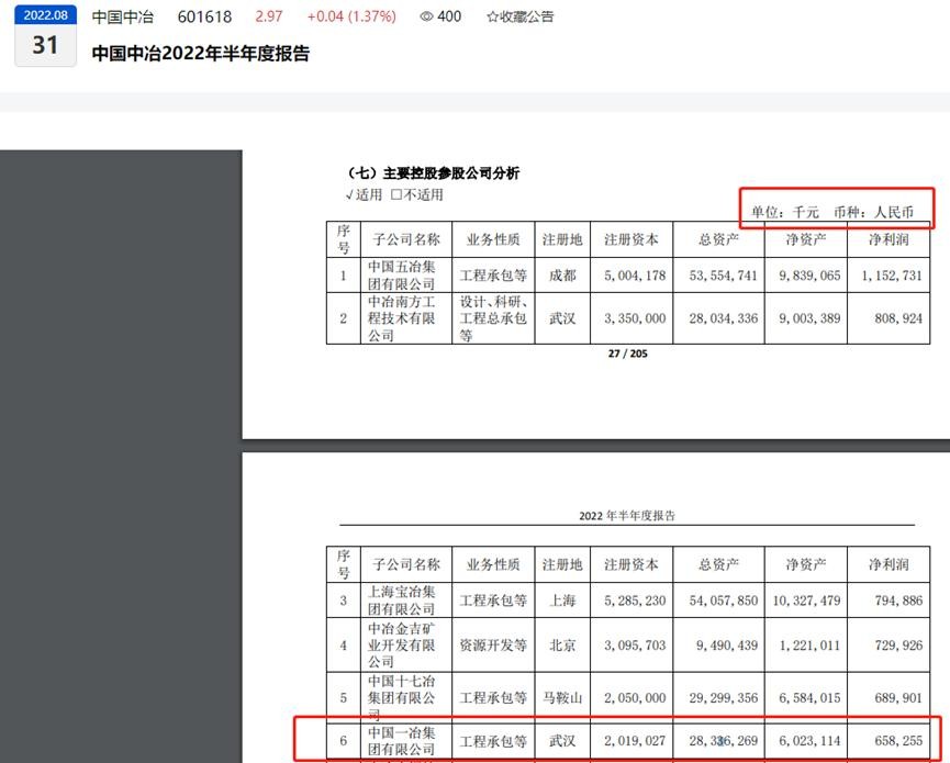 截至2022年6月,中国中冶持有中国一冶98.26股权,中国一冶总资产283.36亿元,净资产60.23亿元,上半年净利润6.58亿元。