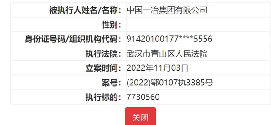 案号为(2022)鄂0107执3385号的记录显示,立案时间为2022年11月03日,执行法院为武汉市青山区人民法院,被执行人名称为中国一冶集团有限公司,执行标的为7730560元。